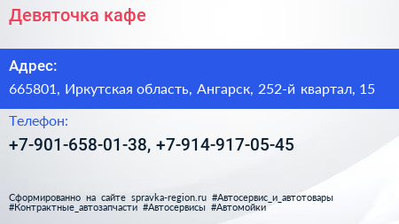 Девяточка, кафе по адресу 665801, Иркутская область, Ангарск, 252-й квартал, 15 в дальнейшем Организация, размещена в следующих категориях: