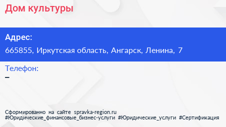 Дом культуры по адресу 665855, Иркутская область, Ангарск, Ленина, 7 в дальнейшем Организация, размещена в следующих категориях: