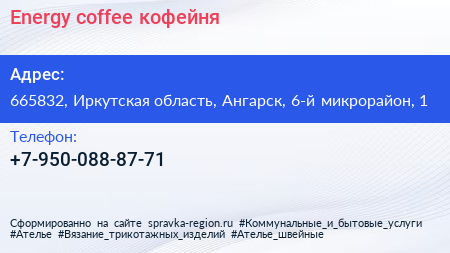Energу coffee, кофейня по адресу 665832, Иркутская область, Ангарск, 6-й микрорайон, 1 в дальнейшем Организация, размещена в следующих категориях: