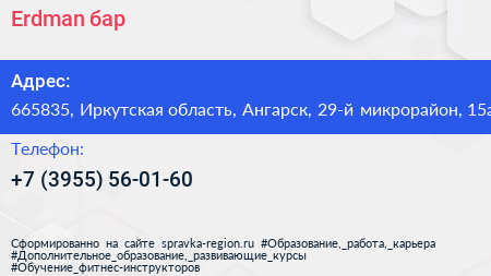 Erdman, бар по адресу 665835, Иркутская область, Ангарск, 29-й микрорайон, 15а в дальнейшем Организация, размещена в следующих категориях: