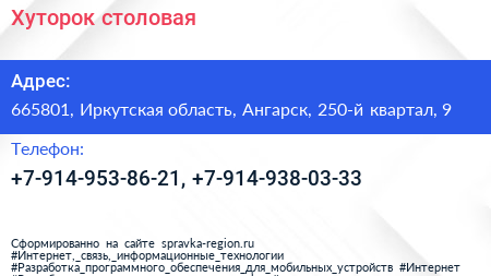 Хуторок, столовая по адресу 665801, Иркутская область, Ангарск, 250-й квартал, 9 в дальнейшем Организация, размещена в следующих категориях: