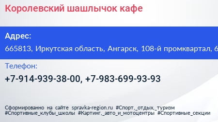 Королевский шашлычок, кафе по адресу 665813, Иркутская область, Ангарск, 108-й промквартал, 6 в дальнейшем Организация, размещена в следующих категориях: