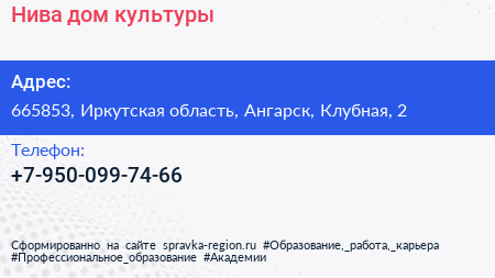 Нива, дом культуры по адресу 665853, Иркутская область, Ангарск, Клубная, 2 в дальнейшем Организация, размещена в следующих категориях:
