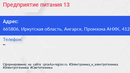 Предприятие питания №13 по адресу 665806, Иркутская область, Ангарск, Промзона АНХК, 412 в дальнейшем Организация, размещена в следующих категориях: