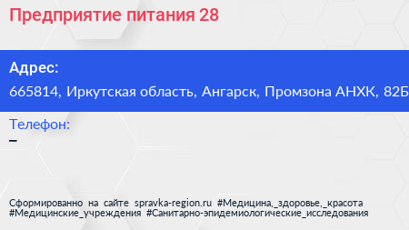Предприятие питания №28 по адресу 665814, Иркутская область, Ангарск, Промзона АНХК, 82Б в дальнейшем Организация, размещена в следующих категориях: