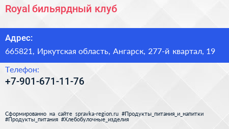 Royal, бильярдный клуб по адресу 665821, Иркутская область, Ангарск, 277-й квартал, 19 в дальнейшем Организация, размещена в следующих категориях: