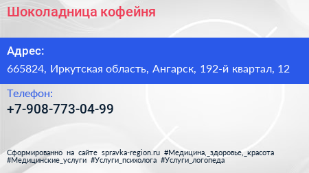 Шоколадница, кофейня по адресу 665824, Иркутская область, Ангарск, 192-й квартал, 12 в дальнейшем Организация, размещена в следующих категориях: