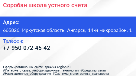 Соробан, школа устного счета по адресу 665826, Иркутская область, Ангарск, 14-й микрорайон, 1 в дальнейшем Организация, размещена в следующих категориях:
