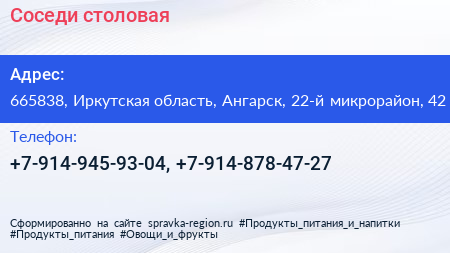 Соседи, столовая по адресу 665838, Иркутская область, Ангарск, 22-й микрорайон, 42 в дальнейшем Организация, размещена в следующих категориях: