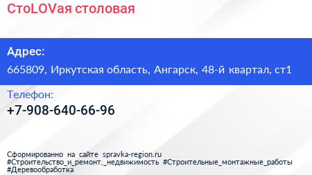 СтоLOVая, столовая по адресу 665809, Иркутская область, Ангарск, 48-й квартал, ст1 в дальнейшем Организация, размещена в следующих категориях: