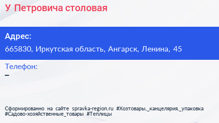 У Петровича, столовая по адресу 665830, Иркутская область, Ангарск, Ленина, 45 в дальнейшем Организация, размещена в следующих категориях: