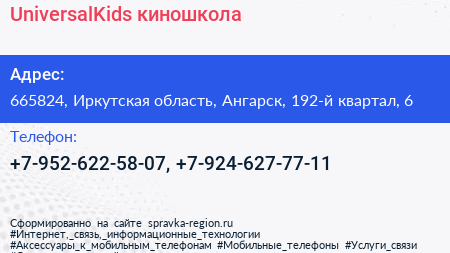 UniversalKids, киношкола по адресу 665824, Иркутская область, Ангарск, 192-й квартал, 6 в дальнейшем Организация, размещена в следующих категориях: