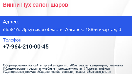 Винни Пух, салон шаров по адресу 665816, Иркутская область, Ангарск, 188-й квартал, 3 в дальнейшем Организация, размещена в следующих категориях: