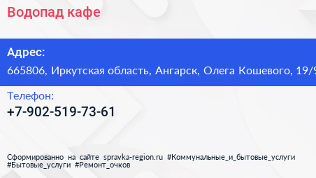 Водопад, кафе по адресу 665806, Иркутская область, Ангарск, Олега Кошевого, 19/9 в дальнейшем Организация, размещена в следующих категориях: