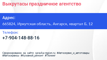 Выкрутасы, праздничное агентство по адресу 665824, Иркутская область, Ангарск, квартал Б, 12 в дальнейшем Организация, размещена в следующих категориях: