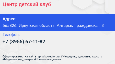Центр, детский клуб по адресу 665826, Иркутская область, Ангарск, Гражданская, 3 в дальнейшем Организация, размещена в следующих категориях: