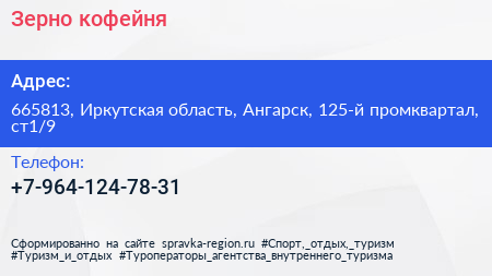 Зерно, кофейня по адресу 665813, Иркутская область, Ангарск, 125-й промквартал, ст1/9 в дальнейшем Организация, размещена в следующих категориях: