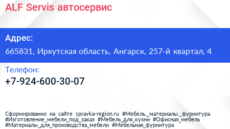 ALF Servis, автосервис по адресу 665831, Иркутская область, Ангарск, 257-й квартал, 4 в дальнейшем Организация, размещена в следующих категориях: