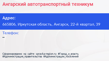 Ангарский автотранспортный техникум по адресу 665806, Иркутская область, Ангарск, 22-й квартал, 39 в дальнейшем Организация, размещена в следующих категориях: