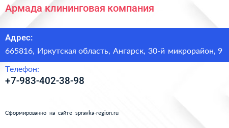 Армада, клининговая компания по адресу 665816, Иркутская область, Ангарск, 30-й микрорайон, 9 в дальнейшем Организация, размещена в следующих категориях: