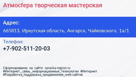 Атмосfера, творческая мастерская по адресу 665813, Иркутская область, Ангарск, Чайковского, 1а/1 в дальнейшем Организация, размещена в следующих категориях: