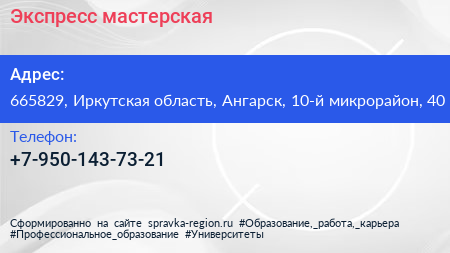 Экспресс, мастерская по адресу 665829, Иркутская область, Ангарск, 10-й микрорайон, 40 в дальнейшем Организация, размещена в следующих категориях: