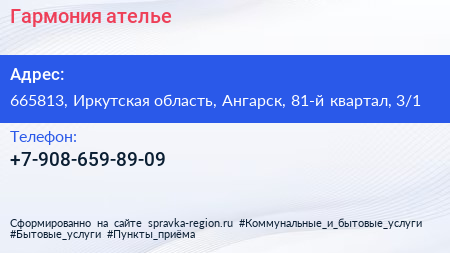 Гармония, ателье по адресу 665813, Иркутская область, Ангарск, 81-й квартал, 3/1 в дальнейшем Организация, размещена в следующих категориях: