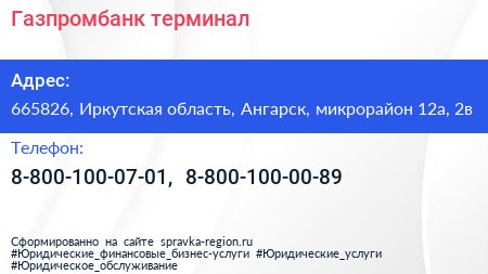 Газпромбанк, терминал по адресу 665826, Иркутская область, Ангарск, микрорайон 12а, 2в в дальнейшем Организация, размещена в следующих категориях: