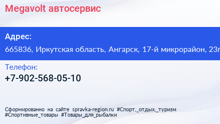 Megavolt, автосервис по адресу 665836, Иркутская область, Ангарск, 17-й микрорайон, 23г в дальнейшем Организация, размещена в следующих категориях: