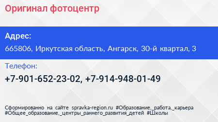 Оригинал, фотоцентр по адресу 665806, Иркутская область, Ангарск, 30-й квартал, 3 в дальнейшем Организация, размещена в следующих категориях: