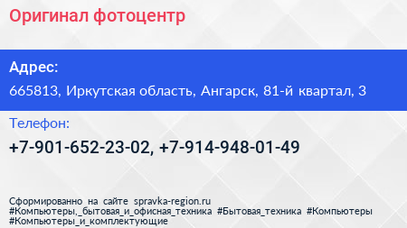 Оригинал, фотоцентр по адресу 665813, Иркутская область, Ангарск, 81-й квартал, 3 в дальнейшем Организация, размещена в следующих категориях: