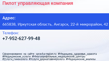 Пилот, управляющая компания по адресу 665838, Иркутская область, Ангарск, 22-й микрорайон, 42 в дальнейшем Организация, размещена в следующих категориях: