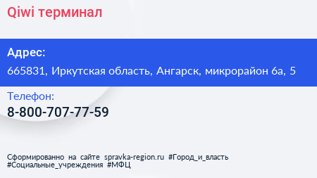 Qiwi, терминал по адресу 665831, Иркутская область, Ангарск, микрорайон 6а, 5 в дальнейшем Организация, размещена в следующих категориях: