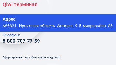 Qiwi, терминал по адресу 665831, Иркутская область, Ангарск, 9-й микрорайон, 85 в дальнейшем Организация, размещена в следующих категориях: