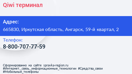 Qiwi, терминал по адресу 665830, Иркутская область, Ангарск, 59-й квартал, 2 в дальнейшем Организация, размещена в следующих категориях: