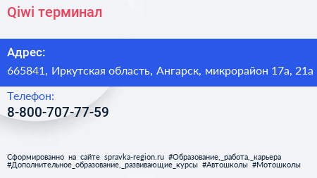 Qiwi, терминал по адресу 665841, Иркутская область, Ангарск, микрорайон 17а, 21а в дальнейшем Организация, размещена в следующих категориях:
