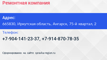 Ремонтная компания по адресу 665830, Иркутская область, Ангарск, 75-й квартал, 2 в дальнейшем Организация, размещена в следующих категориях: