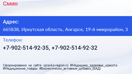 Смин по адресу 665838, Иркутская область, Ангарск, 19-й микрорайон, 3 в дальнейшем Организация, размещена в следующих категориях: