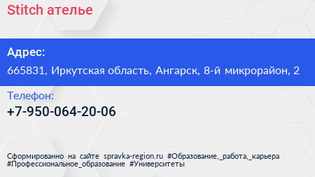 Stitch, ателье по адресу 665831, Иркутская область, Ангарск, 8-й микрорайон, 2 в дальнейшем Организация, размещена в следующих категориях: