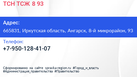 ТСН ТСЖ 8-93 по адресу 665831, Иркутская область, Ангарск, 8-й микрорайон, 93 в дальнейшем Организация, размещена в следующих категориях: