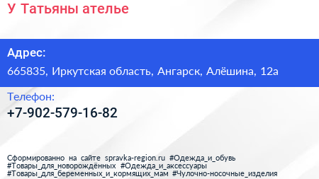 У Татьяны, ателье по адресу 665835, Иркутская область, Ангарск, Алёшина, 12а в дальнейшем Организация, размещена в следующих категориях:
