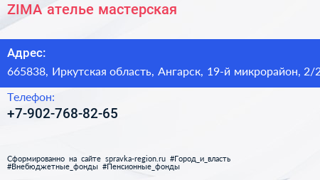 ZIMA, ателье-мастерская по адресу 665838, Иркутская область, Ангарск, 19-й микрорайон, 2/2 в дальнейшем Организация, размещена в следующих категориях: