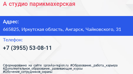 А студио, парикмахерская по адресу 665825, Иркутская область, Ангарск, Чайковского, 31 в дальнейшем Организация, размещена в следующих категориях: