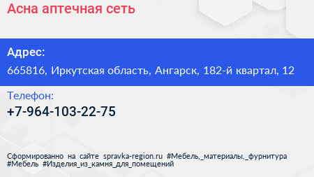 Асна, аптечная сеть по адресу 665816, Иркутская область, Ангарск, 182-й квартал, 12 в дальнейшем Организация, размещена в следующих категориях: