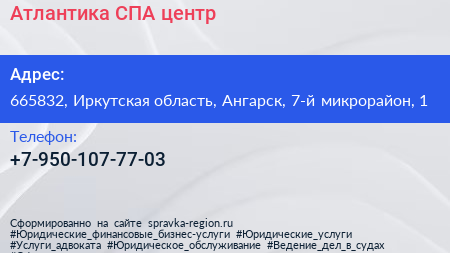 Атлантика, СПА-центр по адресу 665832, Иркутская область, Ангарск, 7-й микрорайон, 1 в дальнейшем Организация, размещена в следующих категориях: