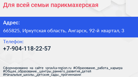 Для всей семьи, парикмахерская по адресу 665825, Иркутская область, Ангарск, 92-й квартал, 3 в дальнейшем Организация, размещена в следующих категориях: