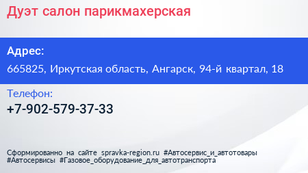 Дуэт, салон-парикмахерская по адресу 665825, Иркутская область, Ангарск, 94-й квартал, 18 в дальнейшем Организация, размещена в следующих категориях: