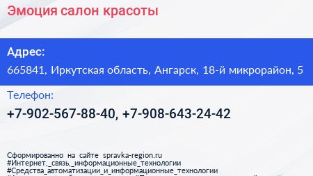 Эмоция, салон красоты по адресу 665841, Иркутская область, Ангарск, 18-й микрорайон, 5 в дальнейшем Организация, размещена в следующих категориях: