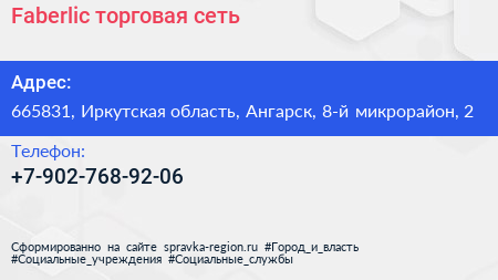 Faberlic, торговая сеть по адресу 665831, Иркутская область, Ангарск, 8-й микрорайон, 2 в дальнейшем Организация, размещена в следующих категориях: