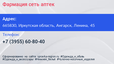 Фармация, сеть аптек по адресу 665830, Иркутская область, Ангарск, Ленина, 45 в дальнейшем Организация, размещена в следующих категориях: